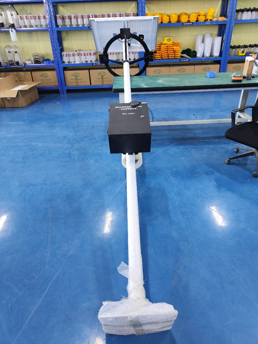 20、設備安裝完成(注:電池線從燈桿底部穿入控制箱;葉面溫濕度傳感器線從控制箱底部穿入控制箱,傳感器固定于樹枝枝干上)